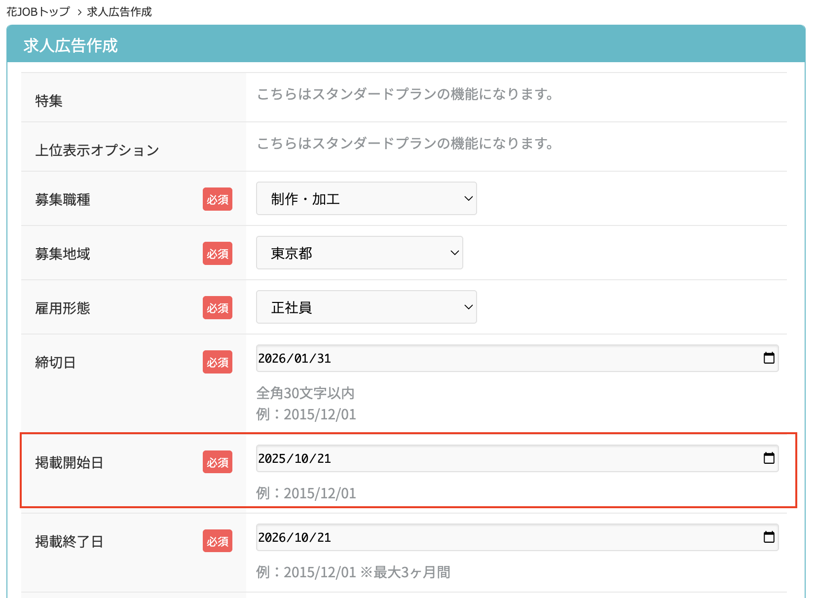 掲載開始する日は設定できますか? 2025年12月22日 08:46 更新 はい。任意の掲載開始日を登録することが可能です。求人作成画面にて「掲載開始日」を掲載希望日に設定ください。※掲載開始日は必須項目となります。特に希望日がない場合でもご登録が必要となります。 関連記事 掲載求人の取り下げる日を設定できますか?